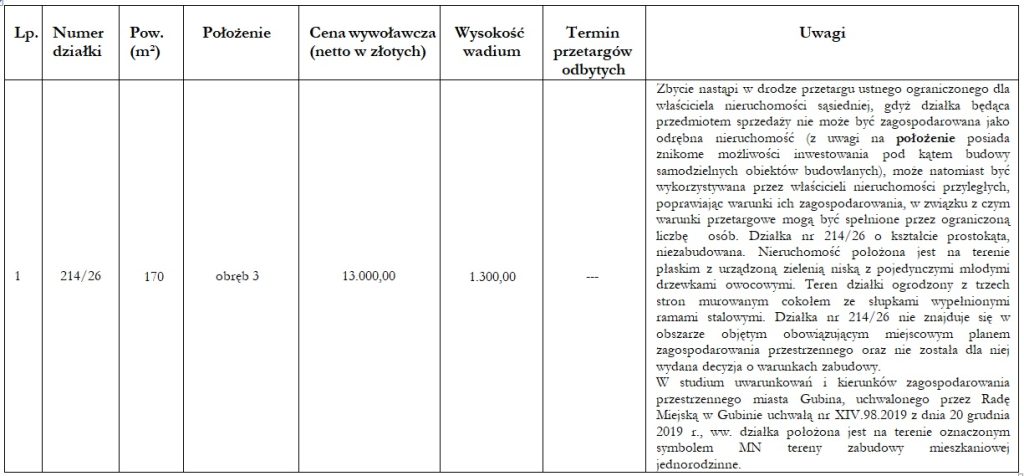 Szczegółowych informacji odnośnie zbywanej nieruchomości można uzyskać w Wydziale Gospodarki Nieruchomościami Urzędu Miejskiego w Gubinie, ul. Piastowska 24, tel. (68) 4558133, w godzinach pracy urzędu. Ogłoszenie o przetargu jest zamieszczone na stronach internetowych Urzędu Miejskiego w Gubinie www.gubin.pl, www.bip.gubin.pl, www.infopublikator.pl, www.infoinwestycje.pl.