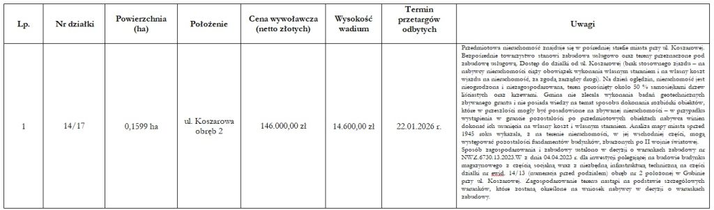 Przetarg odbędzie się dnia 23 kwietnia 2026 r. o godz. 9:00 w sali narad Urzędu Miejskiego w Gubinie ul. Piastowska 24.