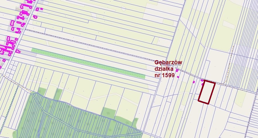 - Nieruchomość gruntowa, oznaczona w ewidencji gruntów i budynków jako działka Nr 1599 o pow. 6800m2, położona w miejscowości Gębarzów