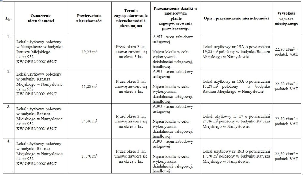 Burmistrz Namysłowa podaje do publicznej wiadomości, że w dniach od 31.03.2026r. do 21.04.2026 r. na tablicy ogłoszeń w Urzędzie Miejskim w Namysłowie przy ul. Stanisława Dubois 3 (budynek B, III piętro) oraz na stronie internetowej Urzędu Miejskiego w Namysłowie, w Biuletynie Informacji Publicznej zostanie wywieszony wykaz nieruchomości, stanowiących mienie komunalne Gminy Namysłów, przeznaczonych do najmu lokali użytkowych.