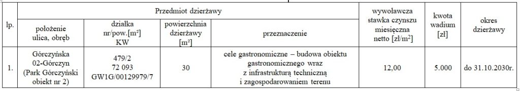 Dla obiektu warunki zabudowy ustalają budowę obiektu gastronomicznego o jednej kondygnacji nadziemnej i maksymalnej powierzchni zabudowy do 30m2, sytuowanych w jednej linii wzdłuż utwardzonej ścieżki wraz z infrastrukturą techniczna i zagospodarowaniem terenu. Dopuszcza się wydzierżawienie dodatkowej powierzchni na sezonowy ogródek gastronomiczny oraz na cele składowe o łącznej pow. 84m2 – według stawek określonych w Zarządzeniu nr 15/2025 Prezydenta Miasta Gorzowa Wielkopolskiego z dnia 14 stycznia 2025r.