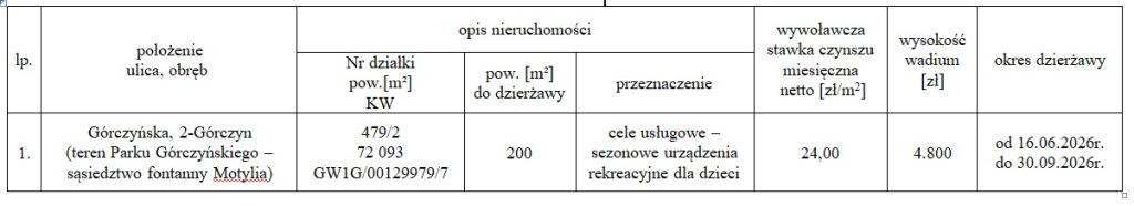 Ogłoszenie Nr 26/2026 Prezydenta Miasta Gorzowa Wielkopolskiego o I przetargu ustnym nieograniczonym na dzierżawę