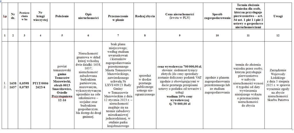 Działając na podstawie art.35 ust. ust.1 i 2 ustawy z dnia 21 sierpnia 1997 r. o gospodarce nieruchomościami (t. j. Dz. U. z 2024 r. poz. 1145 ze zm.) ogłaszam, że z zasobu nieruchomości Skarbu Państwa przeznaczone zostały do zbycia nieruchomości położone na terenie powiatu tomaszowskiego
