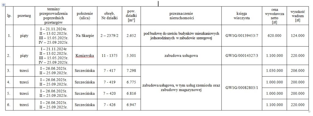 Przetargi odbędą się 22 stycznia 2026r. o godz. 1000 w siedzibie Urzędu Miasta Gorzowa Wlkp. przy ul.Sikorskiego 4 i prowadzone będą wg kolejności podanej w tabeli.