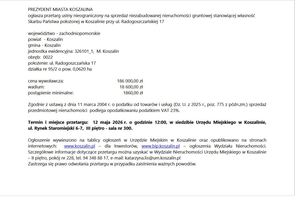 Prezydent Miasta Koszalina ogłasza przetarg ustny nieograniczony na sprzedaż