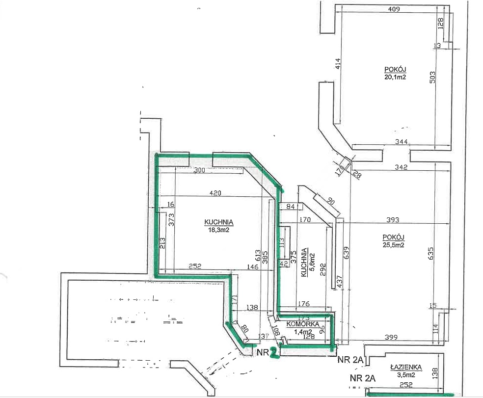Powierzchnia użytkowa lokalu wynosi 92,4 m². W skład lokalu wchodzą: 3 pokoje, kuchnia, komórka, łazienka. Wyposażony jest w 2 balkony. Kuchnia i łazienka z oddzielnym wejściem z korytarza wspólnego dla lokali 2a i 2. Korytarz stanowi części wspólne budynku. Lokal wymaga prac remontowo-naprawczych.