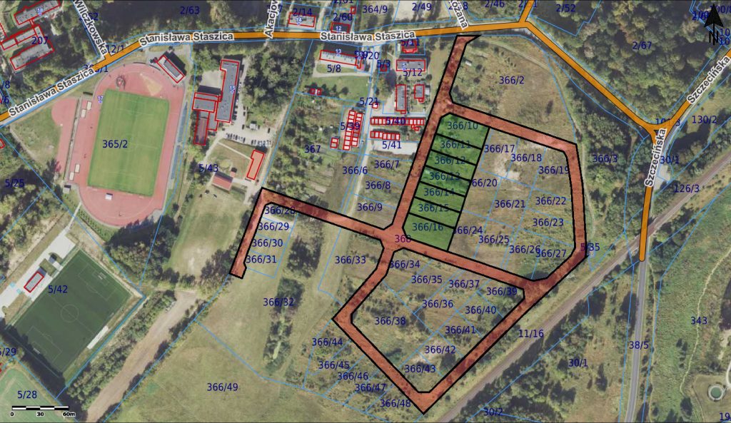 1. Oznaczenie nieruchomości według księgi wieczystej oraz katastru nieruchomości – Nieruchomość ujawniona w księdze wieczystej KO1I/00034443/6 położona jest w południowo-zachodniej części miasta Szczecinek, w rejonie ul. St. Staszica, w pobliżu jeziora Trzesiecko. Nieruchomość obejmuje działkę ewidencyjną nr: 366/10 o pow. 0,1284 ha, 366/11 o pow. 0,0932 ha, 366/12 o pow. 0,0934 ha, 366/13 o pow. 0,0935 ha, 366/14 o pow. 0,0937 ha, 366/15 o pow. 0,0938 ha, 366/16 o pow. 0,1298 ha położoną w obrębie ewidencyjnym nr 0027 Świątki miasta Szczecinek.