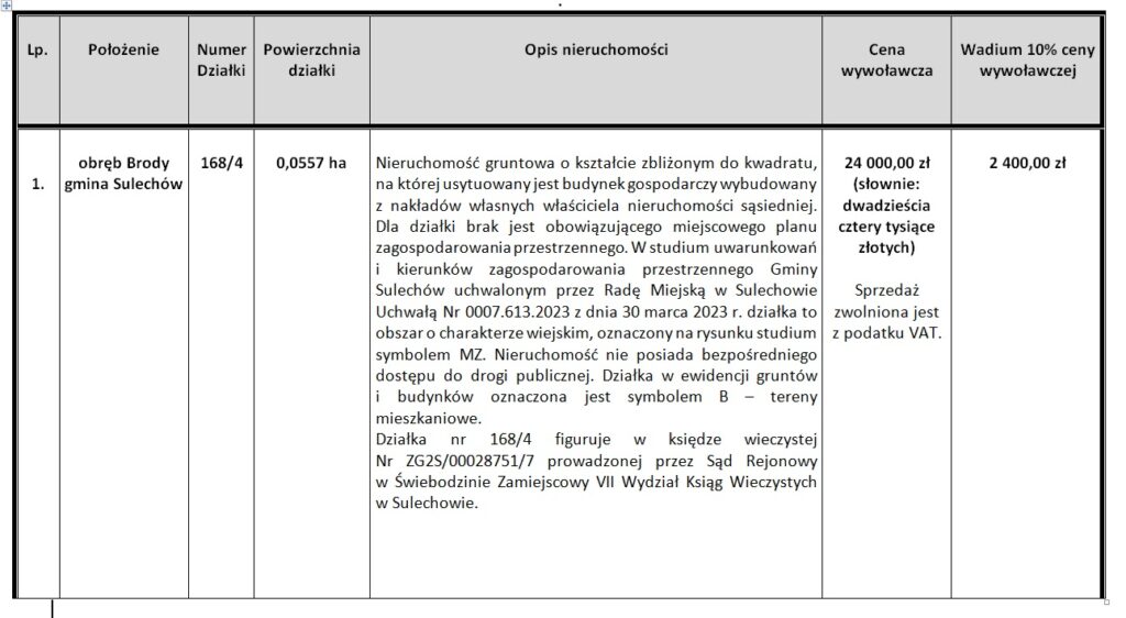 – Ze względu na brak dostępu do drogi publicznej działki przetarg ogranicza się do właścicieli (współwłaścicieli) nieruchomości graniczących z w/w działką.