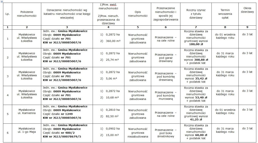 Wójt Gminy Mysłakowice podaje do publicznej wiadomości wykaz nieruchomości przeznaczonych do dzierżawy: