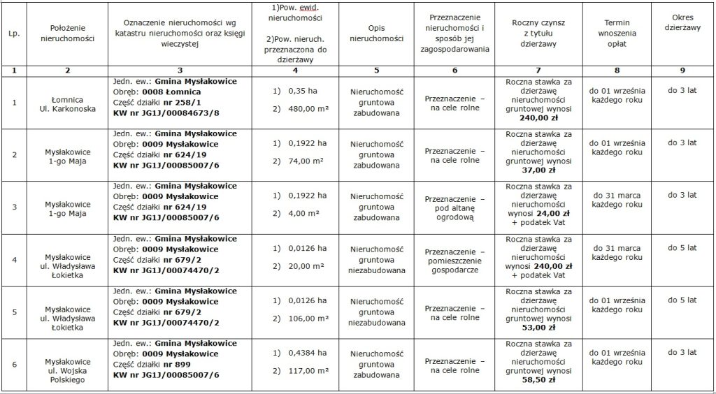 Wójt Gminy Mysłakowice podaje do publicznej wiadomości wykaz nieruchomości przeznaczonych do dzierżawy: