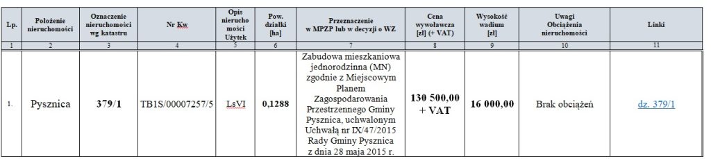Przetarg ustny oddzielnie na każdą nieruchomość wg. kolejności uwzględnionej w w/w tabeli odbędzie się w dniu 17.03.2026 r. o godz. 900 w budynku Urzędu Gminy  w Pysznicy ul. Wolności 322.