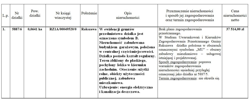 Szczegółowe informacje o nieruchomościach ujętych w niniejszym wykazie można uzyskać w Urzędzie Gminy w Rakszawie, pokój nr 8, tel. 17 2261281 wewn. 28.