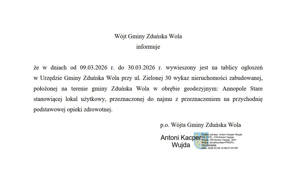 Wójt Gminy Zduńska Wola informuje o wywieszeniu wykazu nieruchomości przeznaczonej do najmu