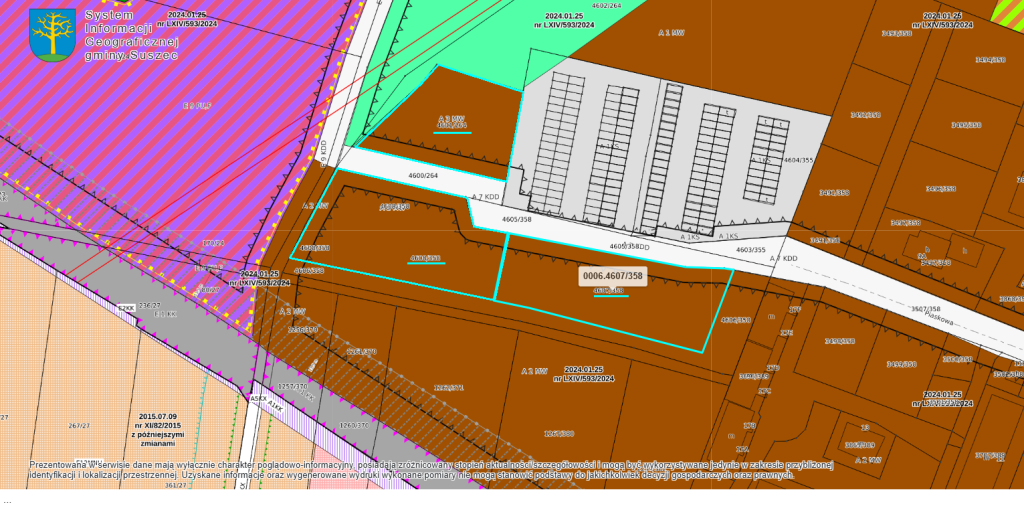 1) nr 4607/358, obręb Suszec, powierzchnia 0,2745 ha (użytki: RIVa 0,1508 ha, RIVb 0,1237 ha), KW KA1P/00032355/3,