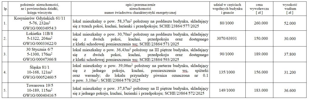 Przetargi odbędą się 26 marca 2026 r. o godz. 1000 w siedzibie Urzędu Miasta Gorzowa Wielkopolskiego przy ul. Sikorskiego 4 i prowadzone będą wg kolejności podanej w tabeli.