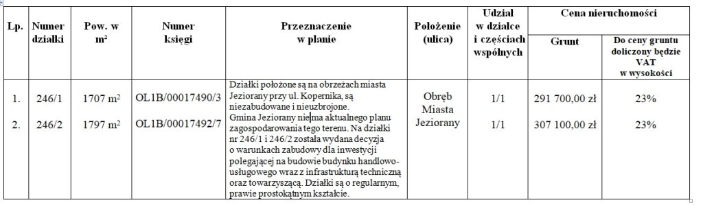 nieruchomości położonej w obrębie miasta Jeziorany przeznaczonej do sprzedaży w przetargu ustnym nieograniczonym na podstawie Zarządzenia Nr 17/2026 Burmistrza Jezioran z dnia 9 lutego 2026 roku w sprawie zbycia nieruchomości.