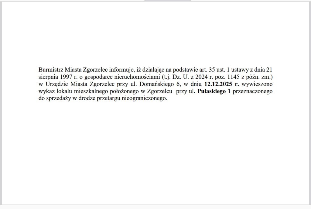 Burmistrz Miasta Zgorzelec informuje, iż działając na podstawie art. 35 ust. 1 ustawy z dnia 21 sierpnia 1997 r. o gospodarce nieruchomościami (t.j. Dz. U. z 2024 r. poz. 1145 z późn. zm.) w Urzędzie Miasta Zgorzelec przy ul. Domańskiego 6, w dniu 12.12.2025 r. wywieszono wykaz lokalu mieszkalnego położonego w Zgorzelcu przy ul. Pułaskiego 1 przeznaczonego do sprzedaży w drodze przetargu nieograniczonego.
