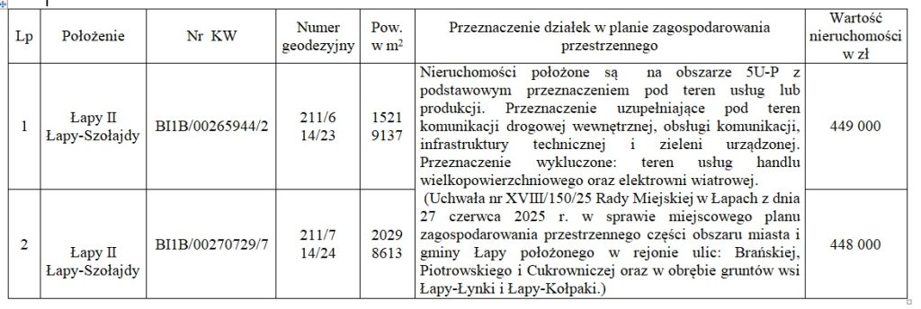 Na podstawie art. 35 ust. 1 i 2 ustawy z dnia 21 sierpnia 1997 r. o gospodarce nieruchomościami (t.j. Dz. U. z 2026 r. poz. 399), podaje do publicznej wiadomości, że niżej wykazane nieruchomości położone w obrębie m. Łapy II i Łapy-Szołajdy, gmina Łapy zostały przeznaczone