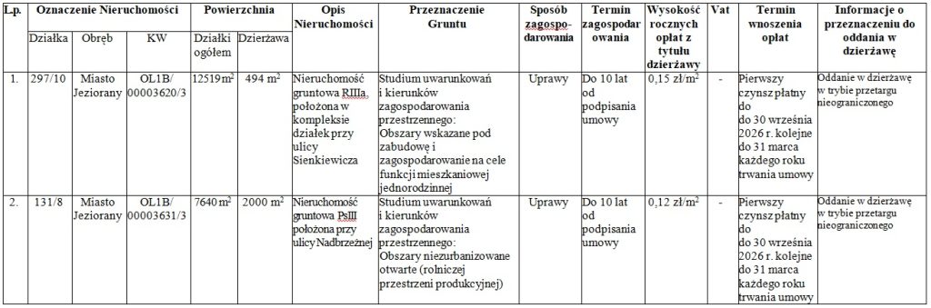 nieruchomości położonych w mieście Jeziorany przeznaczonych do wydzierżawienia na podstawie Zarządzenia Nr 42/2026 Burmistrza Jezioran z dnia 27 kwietnia 2026 roku: