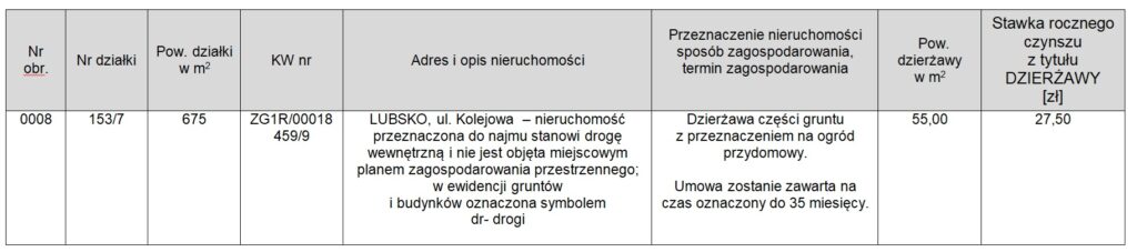 Wykaz nieruchomości stanowiącej własność Gminy Lubsko przeznaczonej do dzierżawy w trybie bezprzetargowym