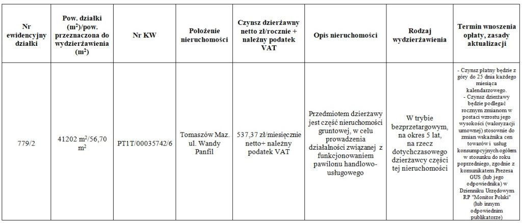 Wykaz dotyczący części nieruchomości przeznaczonej do oddania w dzierżawę w trybie bezprzetargowym położonej w obrębie 23 Tomaszowa Mazowieckiego, oznaczonej numerem działki 779/2 (ulica Wandy Panfil)