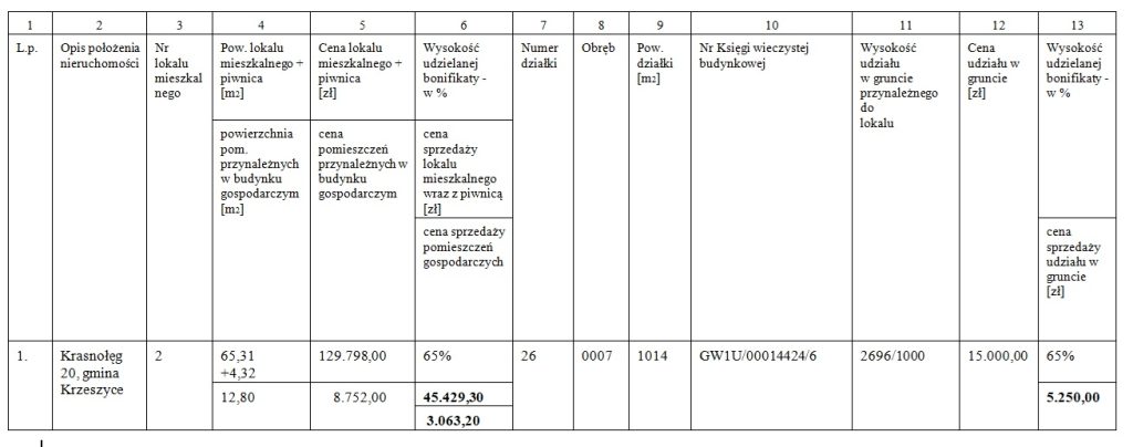 § 1. Wyraża się zgodę na sprzedaż – na rzecz najemcy – w trybie bezprzetargowym lokalu mieszkalnego nr 2 usytuowanego w budynku nr 20 w Krasnołęgu oraz pomieszczeń przynależnych wraz z udziałem w wysokości 2696/1000 części w nieruchomości wspólnej, położonym na działce nr 26 o powierzchni 0,1014 ha , obręb nr 0007 – Krasnołęg, gmina Krzeszyce, objętej KW Nr GW1U/00014424/6, stanowiącego własność Gminy Krzeszyce, objętego wykazem stanowiącym załącznik do niniejszego zarządzenia i będącym jego integralną częścią.