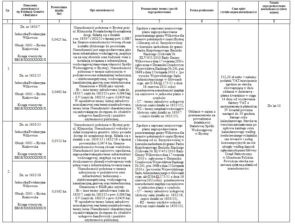 § 1. Przeznaczyć do oddania w dzierżawę na okres do lat 10 nieruchomości gruntowe będące własnością Gminy Wilkowice, położone w Jednostce Ewidencyjnej: Wilkowice, Obręb: 0001 – Bystra Krakowska, stanowiące działki nr: