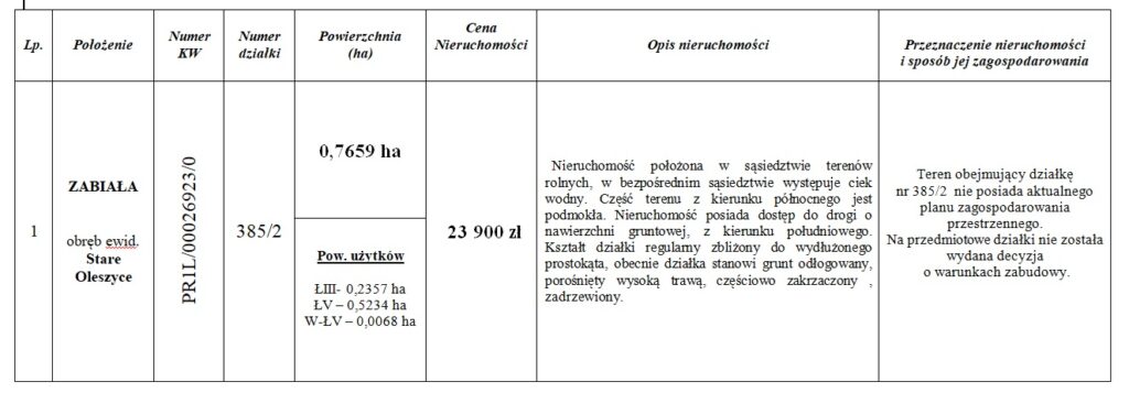 WYKAZ NIERUCHOMOŚCI STANOWIĄCEJ WŁASNOŚĆ GMINY OLESZYCE PRZEZNACZONEJ DO SPRZEDAŻY W TRYBIE PRZETARGOWYM