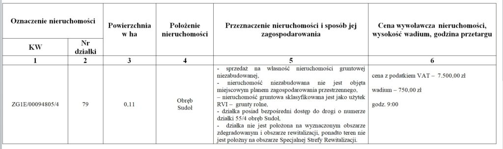 Przetarg odbędzie się w dniu 20.11.2025 r. w siedzibie Urzędu Gminy i Miasta w Czerwieńsku ul. Rynek 25. Warunkiem przystąpienia do przetargu jest wpłacenie wadium w pieniądzu z określeniem adresu nieruchomości, nr działki, której wpłata dotyczy najpóźniej do dnia 17.11.2025 r. na konto Gminy Czerwieńsk: 74 1020 5402 0000 0602 0027 8861. Uwaga! data dokonania wpłaty wadium jest datą, uznania rachunku bankowego Gminy. Wadium powinno być wniesione z takim wyprzedzeniem, aby środki pieniężne znalazły się na koncie Gminy najpóźniej w dniu 17.11.2025 r. pod rygorem uznania, że warunek wpłaty wadium nie został spełniony. W/w nieruchomość ogłoszona do przetargu nie jest obciążona prawem osób trzecich, jak również nie jest przedmiotem jakichkolwiek zobowiązań wobec osób trzecich. Wadium wpłacone przez uczestnika, który wygra przetarg zalicza się na poczet ceny nabycia nieruchomości. Zwrot wadium pozostałym uczestnikom przetargu nastąpi w terminie trzech dni od dnia zamknięcia bądź odwołania przetargu przelewem na podane konto bankowe. Zastrzega się prawo do odwołania przetargu tylko z uzasadnionej przyczyny w formie właściwej dla jego ogłoszenia. Ogłoszenie o przetargu zostanie opublikowane, na stronie internetowej Urzędu www.czerwiensk.pl w Biuletynie Informacji publicznej www.bip.czerwiensk.pl oraz na tablicy ogłoszeń w siedzibie Urzędu i na tablicy ogłoszeń w miejscowości Sudoł, a także w prasie elektronicznej Infopublikator.pl spełniającej wymogi prasy lokalnej obejmującej co najmniej powiat, na terenie którego położona jest nieruchomość. Szczegółowe informacje dot. przetargu można uzyskać w Urzędzie Gminy i Miasta pokój 109 lub pod numerem tel. 68 3278179