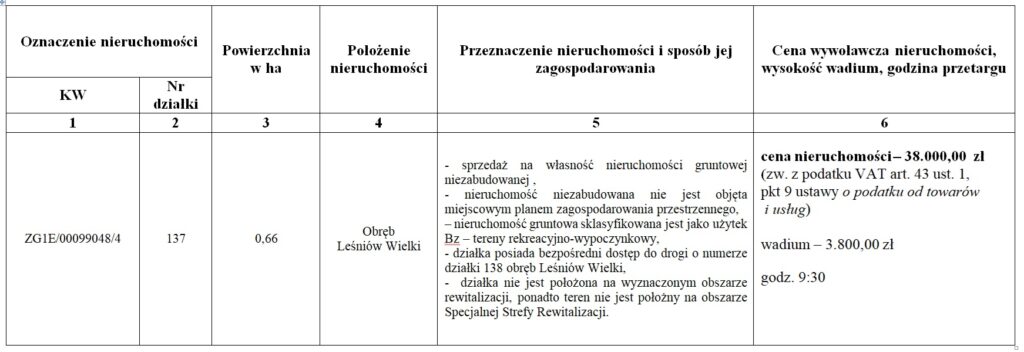 Przetarg odbędzie się w dniu 23.01.2026 r. w siedzibie Urzędu Gminy i Miasta w Czerwieńsku ul. Rynek 25. Warunkiem przystąpienia do przetargu jest wpłacenie wadium w pieniądzu z określeniem adresu nieruchomości, nr działki, której wpłata dotyczy najpóźniej do dnia 19.01.2026 r. na konto Gminy Czerwieńsk: 74 1020 5402 0000 0602 0027 8861. Uwaga! data dokonania wpłaty wadium jest datą, uznania rachunku bankowego Gminy. Wadium powinno być wniesione z takim wyprzedzeniem, aby środki pieniężne znalazły się na koncie Gminy najpóźniej w dniu 19.01.2026 r. pod rygorem uznania, że warunek wpłaty wadium nie został spełniony. W/w nieruchomość ogłoszona do przetargu nie jest obciążona prawem osób trzecich, jak również nie jest przedmiotem jakichkolwiek zobowiązań wobec osób trzecich. Wadium wpłacone przez uczestnika, który wygra przetarg zalicza się na poczet ceny nabycia nieruchomości. Zwrot wadium pozostałym uczestnikom przetargu nastąpi w terminie trzech dni od dnia zamknięcia bądź odwołania przetargu przelewem na podane konto bankowe. Zastrzega się prawo do odwołania przetargu tylko z uzasadnionej przyczyny w formie właściwej dla jego ogłoszenia. Ogłoszenie o przetargu zostanie opublikowane, na stronie internetowej Urzędu www.czerwiensk.pl w Biuletynie Informacji publicznej www.bip.czerwiensk.pl oraz na tablicy ogłoszeń w siedzibie Urzędu i na tablicy ogłoszeń w miejscowości Leśniów Wielki, a także w prasie elektronicznej Infopublikator.pl spełniającej wymogi prasy lokalnej obejmującej co najmniej powiat, na terenie którego położona jest nieruchomość. Szczegółowe informacje dot. przetargu można uzyskać w Urzędzie Gminy i Miasta pokój 109 lub pod numerem tel. 68 3278179