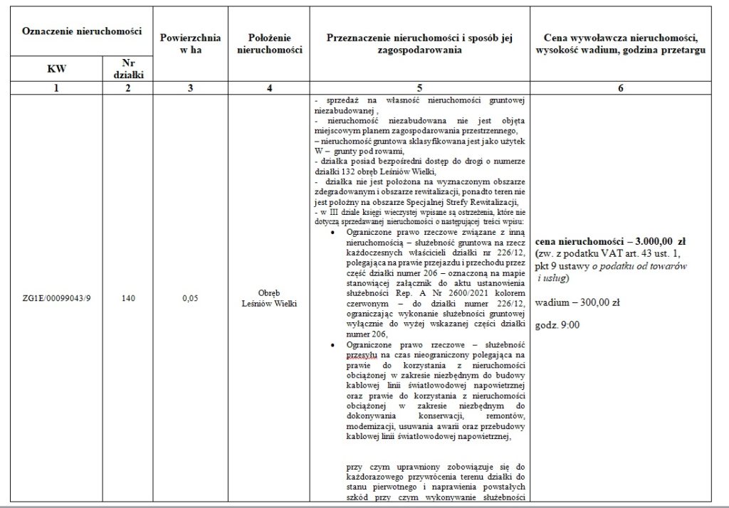 Przetarg odbędzie się w dniu 20.02.2026 r. w siedzibie Urzędu Gminy i Miasta w Czerwieńsku ul. Rynek 25. Warunkiem przystąpienia do przetargu jest wpłacenie wadium w pieniądzu z określeniem adresu nieruchomości, nr działki, której wpłata dotyczy najpóźniej do dnia 13.02.2026 r. na konto Gminy Czerwieńsk: 74 1020 5402 0000 0602 0027 8861. Uwaga! data dokonania wpłaty wadium jest datą, uznania rachunku bankowego Gminy. Wadium powinno być wniesione z takim wyprzedzeniem, aby środki pieniężne znalazły się na koncie Gminy najpóźniej w dniu 13.02.2026 r. pod rygorem uznania, że warunek wpłaty wadium nie został spełniony. Wadium wpłacone przez uczestnika, który wygra przetarg zalicza się na poczet ceny nabycia nieruchomości. Zwrot wadium pozostałym uczestnikom przetargu nastąpi w terminie trzech dni od dnia zamknięcia bądź odwołania przetargu przelewem na podane konto bankowe. Zastrzega się prawo do odwołania przetargu tylko z uzasadnionej przyczyny w formie właściwej dla jego ogłoszenia. Ogłoszenie o przetargu zostanie opublikowane, na stronie internetowej Urzędu www.czerwiensk.pl w Biuletynie Informacji publicznej www.bip.czerwiensk.pl oraz na tablicy ogłoszeń w siedzibie Urzędu i na tablicy ogłoszeń w miejscowości Leśniów Wielki, a także w prasie elektronicznej Infopublikator.pl spełniającej wymogi prasy lokalnej obejmującej co najmniej powiat, na terenie którego położona jest nieruchomość. Szczegółowe informacje dot. przetargu można uzyskać w Urzędzie Gminy i Miasta pokój 109 lub pod numerem tel. 68 3278179