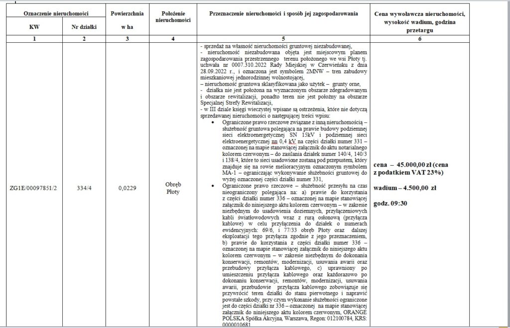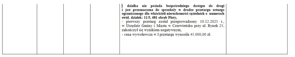 - Termin i miejsce przeprowadzenia przetargu: przetarg odbędzie się w dniu 16.01.2026 r. w siedzibie Urzędu Gminy i Miasta w Czerwieńsku ul. Rynek 25. Ogłoszenie o przetargu zostanie opublikowane, na stronie internetowej Urzędu www.czerwiensk.pl w BIP: www.bip.czerwiensk.pl oraz na tablicy ogłoszeń w siedzibie Urzędu, na tablicy ogłoszeń w miejscowości Płoty, a także w prasie elektronicznej Infopublikator.pl spełniającej wymogi prasy lokalnej obejmującej co najmniej powiat, na terenie którego położona jest nieruchomość. Szczegółowe informacje dot. przetargu można uzyskać w Urzędzie Gminy i Miasta pokój 109 lub pod numerem tel. 68 3278179