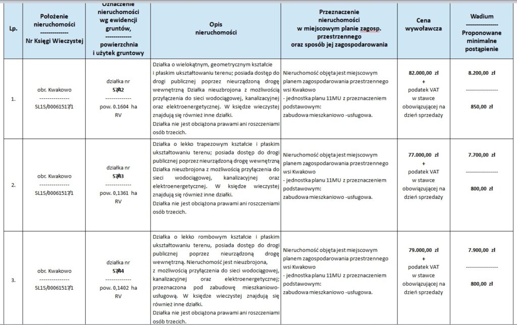 Przystępujący do przetargu winien wpłacić wadium w pieniądzu na konto Urzędu Gminy Kobylnica nr 94 9317 0002 0090 0733 2000 0020 prowadzone przez Bank Spółdzielczy w Sławnie najpóźniej do 30 października 2025 r. (za dzień wniesienia wadium uważa się datę wpływu wymaganej kwoty na wskazane konto). Tytuł wpłaty wadium winien wskazywać jednoznacznie uczestnika przetargu oraz działkę, której wpłata dotyczy.