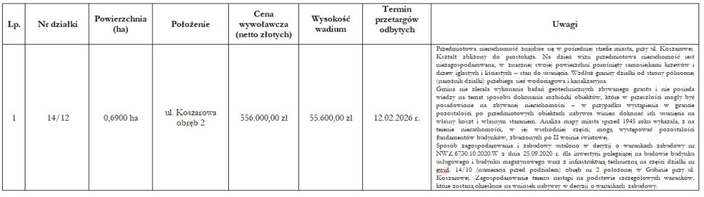 Przetarg odbędzie się dnia 28 maja 2026 r. o godz. 10:00 w sali narad Urzędu Miejskiego w Gubinie ul. Piastowska 24.