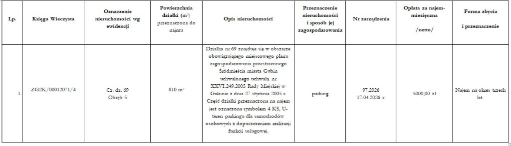 Burmistrz Miasta Gubina podaje do publicznej wiadomości, że Gmina Gubin o statusie miejskim przeznacza do najmu ww. wymienioną nieruchomość według przedstawionego wykazu. Wykaz zostaje wywieszony w terminie od dnia 20.04.2026 r. do dnia 11.05.2026 r. na tablicy ogłoszeń w siedzibie tut. urzędu, na miejskiej stronie internetowej: www.bip.gubin.pl oraz na stronie internetowej, www.infopublikator.pl natomiast informacja o wywieszeniu wykazu została podana do publicznej wiadomości w gazecie lokalnej „Tygodniowa”.