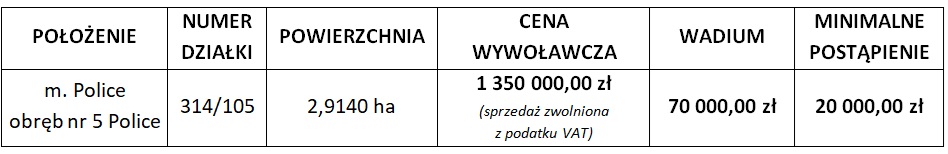 Przetarg odbędzie się w dniu 18 czerwca 2026 r. o godzinie 1000 w siedzibie Urzędu Miejskiego   w Policach, ul. Stefana Batorego 3 (I piętro, sala konferencyjna – pok. nr 32).