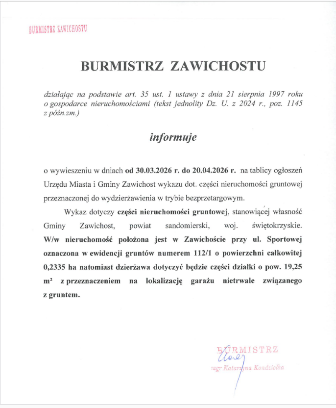 Burmistrz Zawichostu informuje o wywieszeniu wykazu nieruchomości