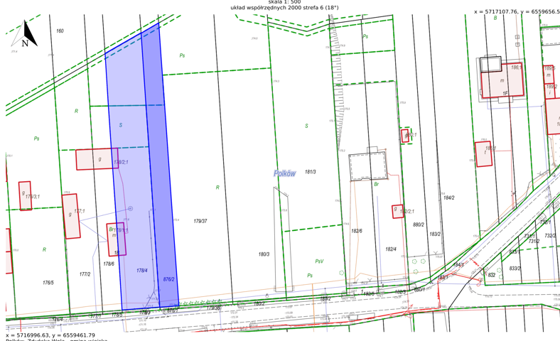 Brak planu zagospodarowania przestrzennego. Dla działek 178/4 i 876/2, została wydana decyzja o warunkach zabudowy budowy budynku mieszkalnego jednorodzinnego. Jest to nieruchomość, na której znajduje się część zabudowań należących do nieruchomości sąsiedniej 178/6 i 177/2