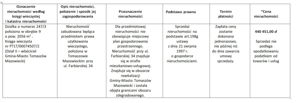Na podstawie art. 35 ustawy z dnia 21 sierpnia 1997 r. o gospodarce nieruchomościami (tekst jednolity Dz. U. z 2024r. poz. 1145 ze zm.), Gmina-Miasto Tomaszów Mazowiecki podaje do publicznej wiadomości wykaz nieruchomości stanowiący własność Gminy-Miasto Tomaszowa Mazowieckiego przeznaczonej do sprzedaży w trybie bezprzetargowym na rzecz użytkownika wieczystego.