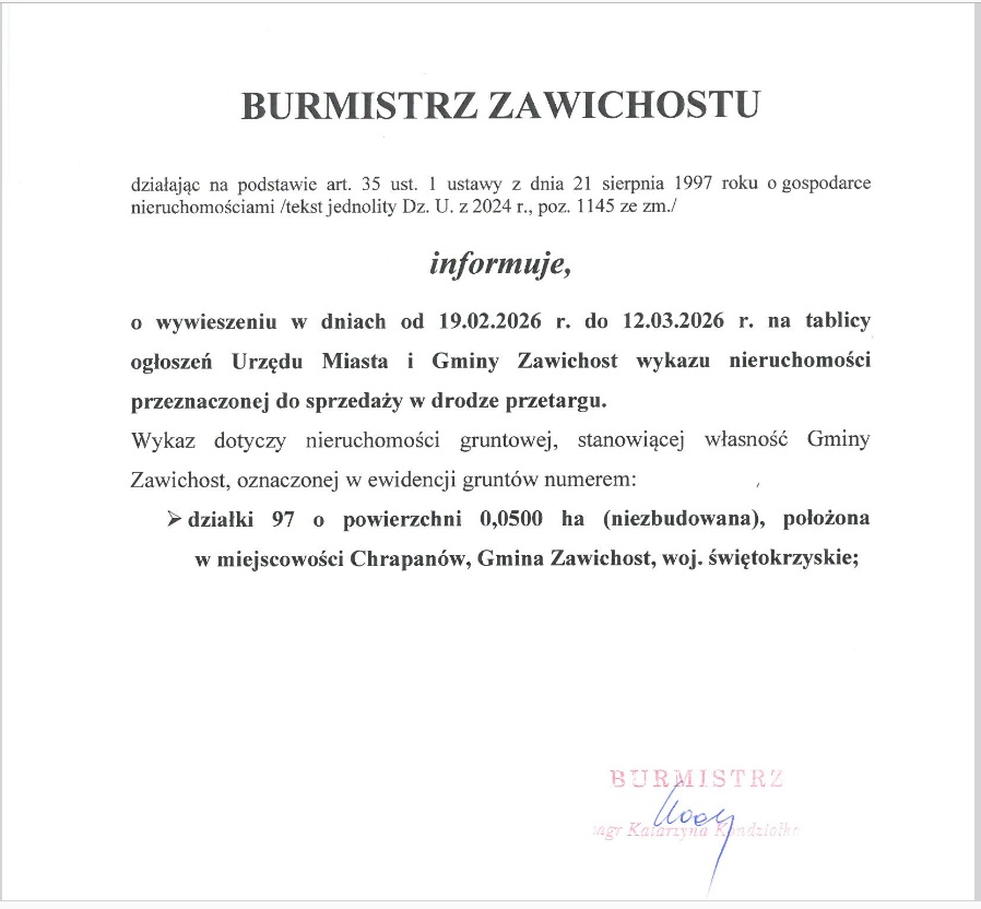 Informacja o wywieszeniu wykazu z dnia 19.02.2026r, wykaz dotyczy nieruchomości gruntowej przeznaczonej do sprzedaży w drodze przetargu