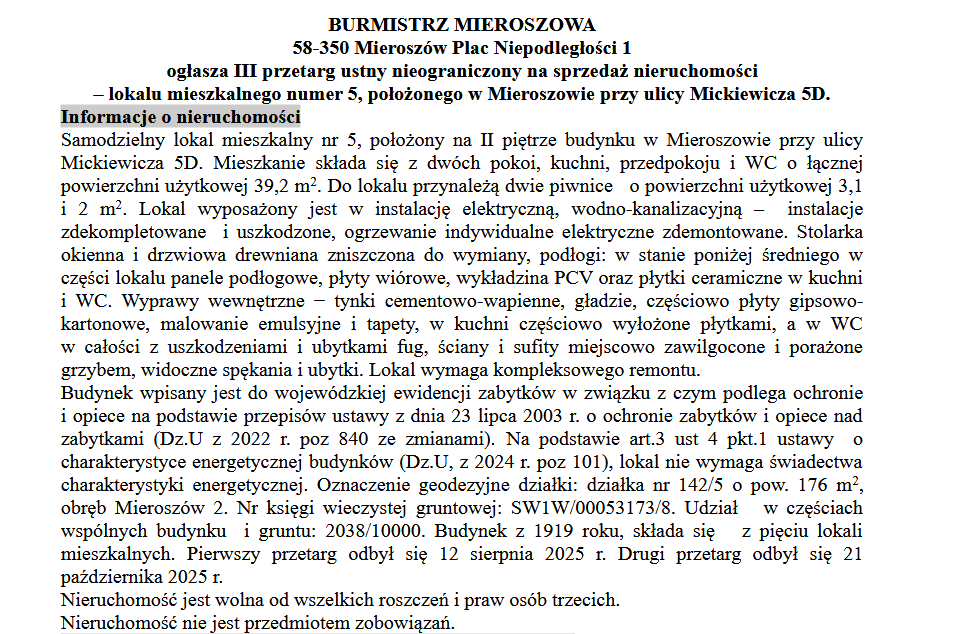 Trzeci przetarg ustny nieograniczony na sprzedaż lokalu mieszkalnego numer 1,położonego w Sokołowsku przy ulicy Głównej 32