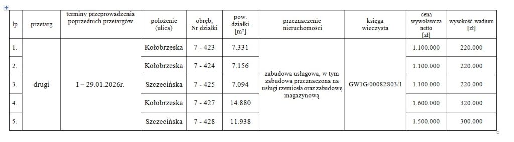 Przetargi odbędą się 07 maja 2026r. o godz. 1000 w siedzibie Urzędu Miasta Gorzowa Wlkp. przy ul.Sikorskiego 4 i prowadzone będą wg kolejności podanej w tabeli.