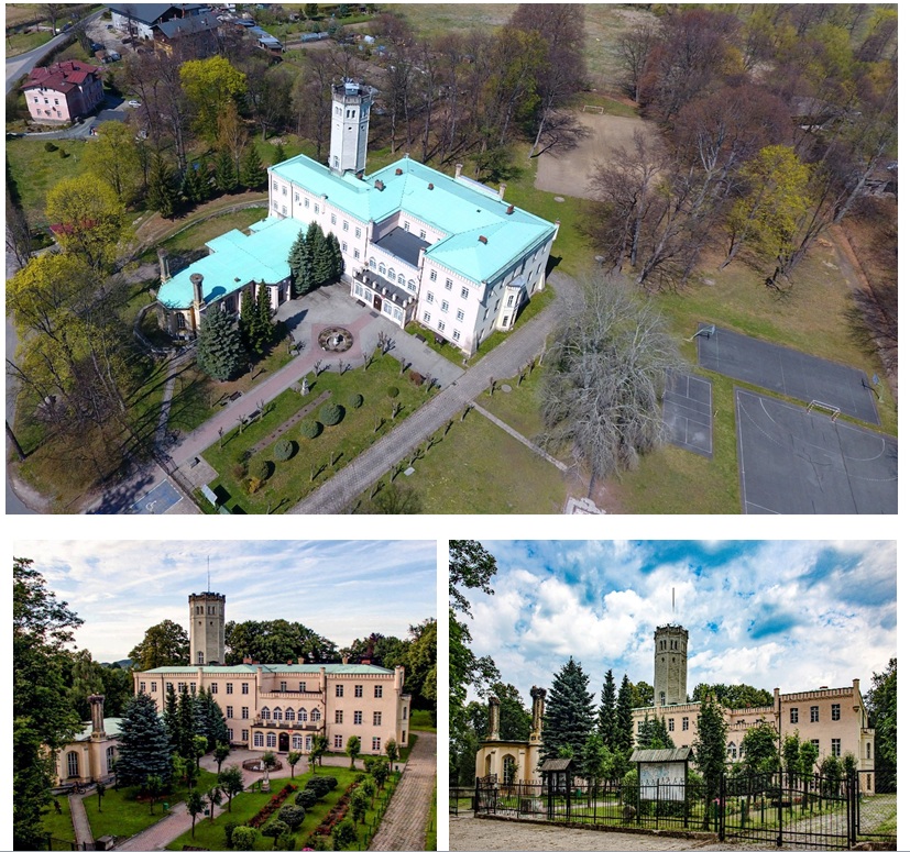| Nieruchomość gruntowa zabudowana, oznaczona ewidencyjnie jako działka nr 608, obręb 0009 Mysłakowice, o powierzchni 2,1234 ha, położona w Mysłakowicach przy ul. Sułkowskiego 1. Działka zabudowana jest budynkiem pałacowym wzniesionym w zabudowie wolnostojącej o powierzchni użytkowej 3.363,04 m2 (budynek wpisany do rejestru zabytków decyzją A/5685/639/J z dnia 13.05.1980 r., aktualnie budynek nieużytkowany, do 2024 r. budynek użytkowany był jako szkoła podstawowa). Działka zagospodarowana: dwa boiska sportowe o nawierzchni trawiastej i asfaltowej, elementy małej architektury, teren zieleni oraz utwardzone alejki – dojścia piesze i dojazdy. W sąsiedztwie budynku znajduje się park pałacowy wpisany do rejestru zabytków decyzją nr A/5374/508/J z dnia 07.12.1977 r. Działka posiada bezpośredni dostęp do drogi publicznej – nieruchomość położona jest przy skrzyżowaniu ulicy 1 Maja z ulicą Sułkowskiego (drogi dwukierunkowe o znaczeniu lokalnym). Teren działki ogrodzony. Wyposażenie w urządzenia infrastruktury technicznej: sieć wodociągowa, sieć kanalizacyjna, sieć gazowa, sieć energetyczna, sieć teletechniczna. | |