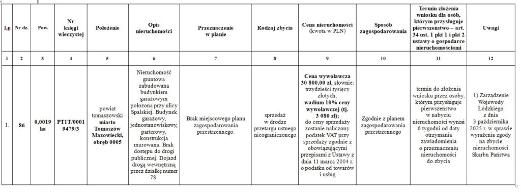Starosta Tomaszowski, wykonujący zadania z zakresu administracji rządowej, stosownie do treści art. 35 ust. 1 i ust. 2 ustawy z dnia 21 sierpnia 1997 r. o gospodarce nieruchomościami (t. j. Dz. U. z 2024 r. poz. 1145z późn. zm.) – podaje do publicznej wiadomości, że na tablicy ogłoszeń w siedzibie Starostwa Powiatowego w Tomaszowie Mazowieckim przy ul. Św. Antoniego 41 (tablica ogłoszeń Wydziału Geodezji i Gospodarki Nieruchomościami – I piętro), a także na stronach internetowych urzędu, tj. w Biuletynie Informacji Publicznej BIP powiatu tomaszowskiego bip.powiat-tomaszowski.pl/aktualnosci wywieszono na okres 21 dni, poczynając od dnia 15 października 2025 r. wykaz nieruchomości przeznaczonych do zbycia w trybie przetargu ustnego nieograniczonego (wykaz dotyczy nieruchomości gruntowej, położonej w gminie Tomaszów Mazowiecki, obręb 0005 Tomaszów Mazowiecki, oznaczonej w ewidencji gruntów jako działka nr 86 o powierzchni 0,0019 ha).