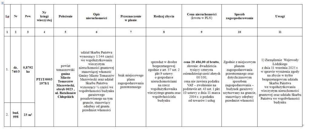 Starosta Tomaszowski, wykonujący zadania z zakresu administracji rządowej, stosownie do treści art. 35 ust. 1 i ust. 2 ustawy z dnia 21 sierpnia 1997 r. o gospodarce nieruchomościami (t. j. Dz. U. z 2024 r. poz. 1145z późn. zm.) – podaje do publicznej wiadomości, że na tablicy ogłoszeń w siedzibie Starostwa Powiatowego w Tomaszowie Mazowieckim przy ul. Św. Antoniego 41 (tablica ogłoszeń Wydziału Geodezji i Gospodarki Nieruchomościami – I piętro), a także na stronach internetowych urzędu, tj. w Biuletynie Informacji Publicznej BIP powiatu tomaszowskiego bip.powiat tomaszowski.pl/aktualnosci wywieszono na okres 21 dni, poczynając od dnia 8 października 2025 r. wykaz nieruchomości przeznaczonych do zbycia w trybie bezprzetargowym (wykaz dotyczy udziału Skarbu Państwa wynoszącego 1/344 części we współużytkowaniu wieczystym nieruchomości gruntowej stanowiącej własność Gminy Miasto Tomaszów Mazowiecki, położonej w Tomaszowie Mazowieckim, przy ul. Batalionów Chłopskich 5, oznaczonej w ewidencji gruntów jako działka nr 740/3 o powierzchni 0,8792 ha oraz udziału Skarbu Państwa, wynoszącego 1/2 części we współwłasności budynku garażowego o powierzchni 23 m2, posadowionego na opisywanej nieruchomości gruntowej i stanowiącego odrębny od gruntu przedmiot własności).