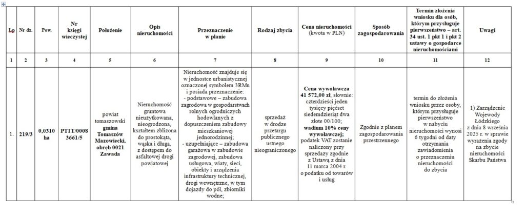 bip.powiat-tomaszowski.pl/aktualnosci wywieszono na okres 21 dni, poczynając od dnia 8 października 2025 r. wykaz nieruchomości przeznaczonych do zbycia w trybie przetargu ustnego nieograniczonego (wykaz dotyczy nieruchomości gruntowej, położonej w gminie Tomaszów Mazowiecki, obręb 0021 Zawada, oznaczonej w ewidencji gruntów jako działka nr 219/3 o powierzchni 0,0310 ha).