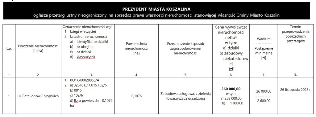 Przetarg zostanie przeprowadzony w dniu 19 marca 2026 r. o godz. 10.00, w siedzibie Urzędu Miejskiego w Koszalinie, Rynek Staromiejski 6-7, sala klubowa A.