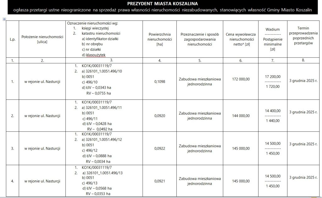 Przetargi zostaną przeprowadzone w dniu 20 marca 2026 r. od godz. 10.00 w siedzibie Urzędu Miejskiego w Koszalinie, Rynek Staromiejski 6-7, sala nr 300 (III piętro).