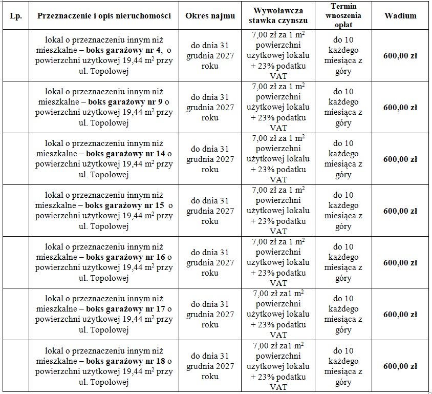 Garaże znajdują się na działkach nr 691/21,691/22,691/24 o powierzchniach 0.0059 ha, 0.0431 ha, 0.0398 ha łącznie 0.0888 ha. Podana wywoławcza stawka czynszu jest w kwocie netto, a więc do wylicytowanej stawki zostanie doliczony podatek VAT według obowiązującej stawki 23%.