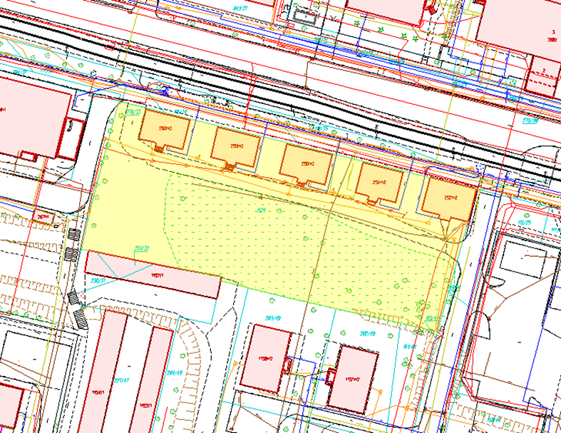 Przedmiotowa działka jest zabudowana pięcioma domami wielorodzinnymi konstrukcji drewnianej, tzw. domami fińskimi.